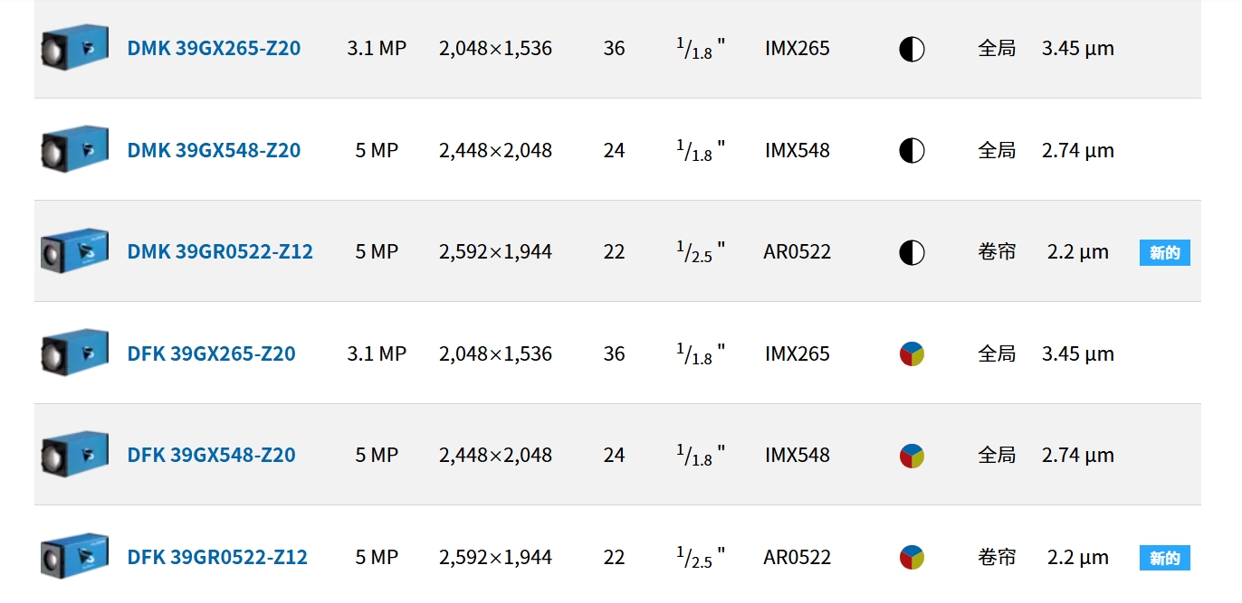 - CMOS传感器: CMOS (Rolling), CMOS Pregius (Global), CMOS Pregius S (Global)